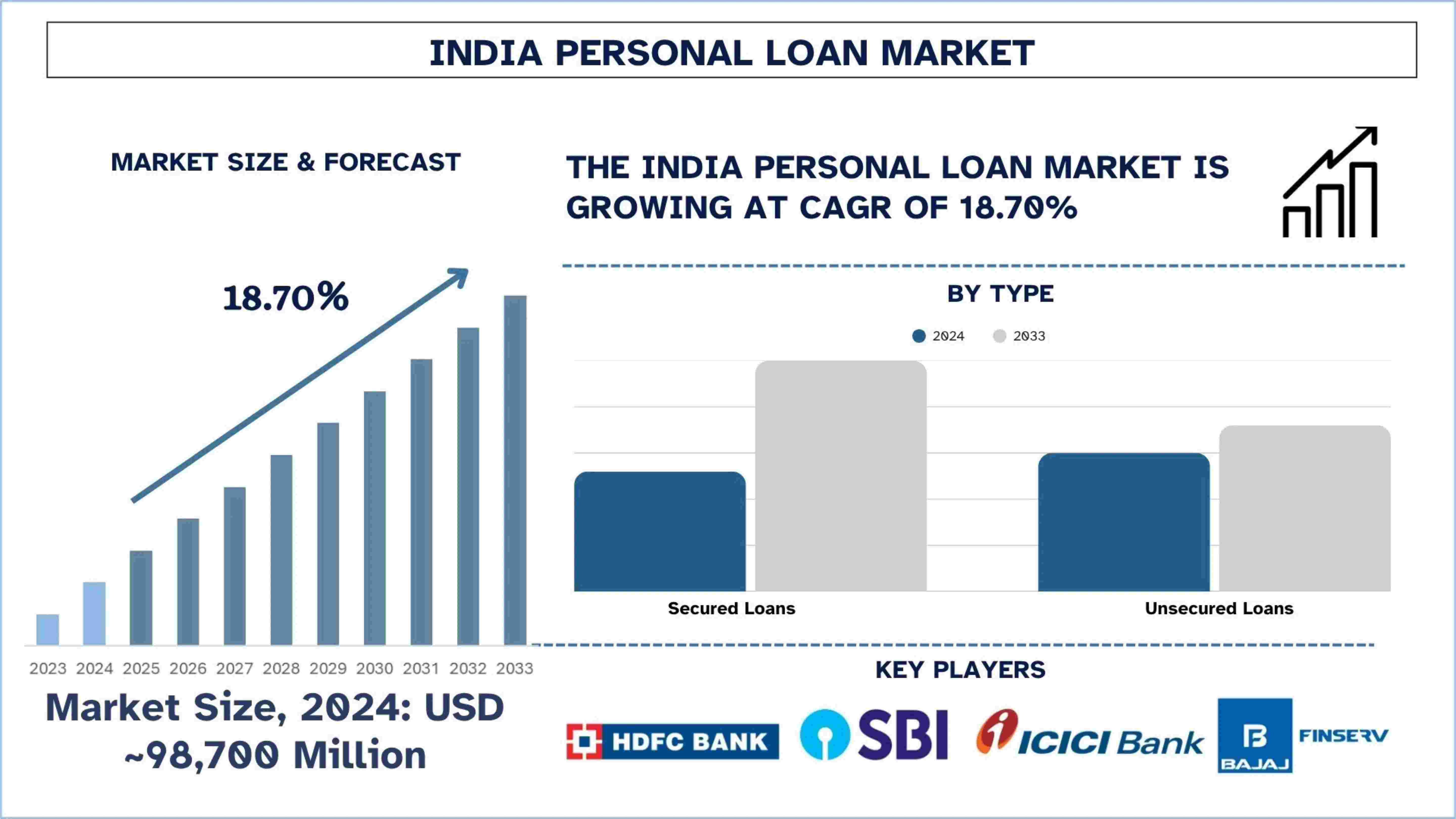 According to the UnivDatos, the rising urbanization and middle-class expansion, digitization of lending services, increase in consumer spending, simplified KYC and credit assessment, growth in Tier II and Tier III cities, expanding credit access to millennials and Gen Z, rising penetration of NBFCs and FinTechs drive the India Personal Loan market. As per their “India Personal Loan Market” report, the Indian market was valued at USD ~98,700 million in 2024, growing at a CAGR of about 18.70% during the forecast period from 2025 - 2033 to reach USD million by 2033.